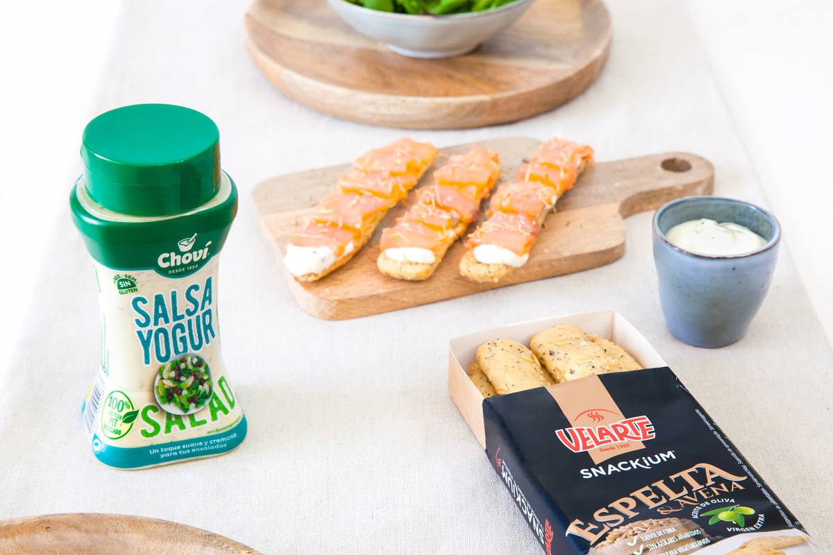 Original aperitivo veraniego de barrita de pan espelta Snakium de Velarte con salsas yogur Choví. ¡Delicioso!