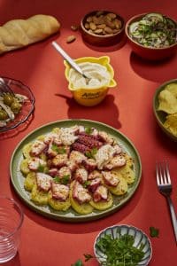 La corvina con patatas, o cualquier otro pescado al horno, se suele acompañar de una base de patata cortada en rodajas, cebolla en Juliana y unas pocas especias. A menudo se rehogan antes de colocarse sobre la bandeja de hornear, dado que los tiempos de cocción del pescado suelen ser inferiores a los de la carne.