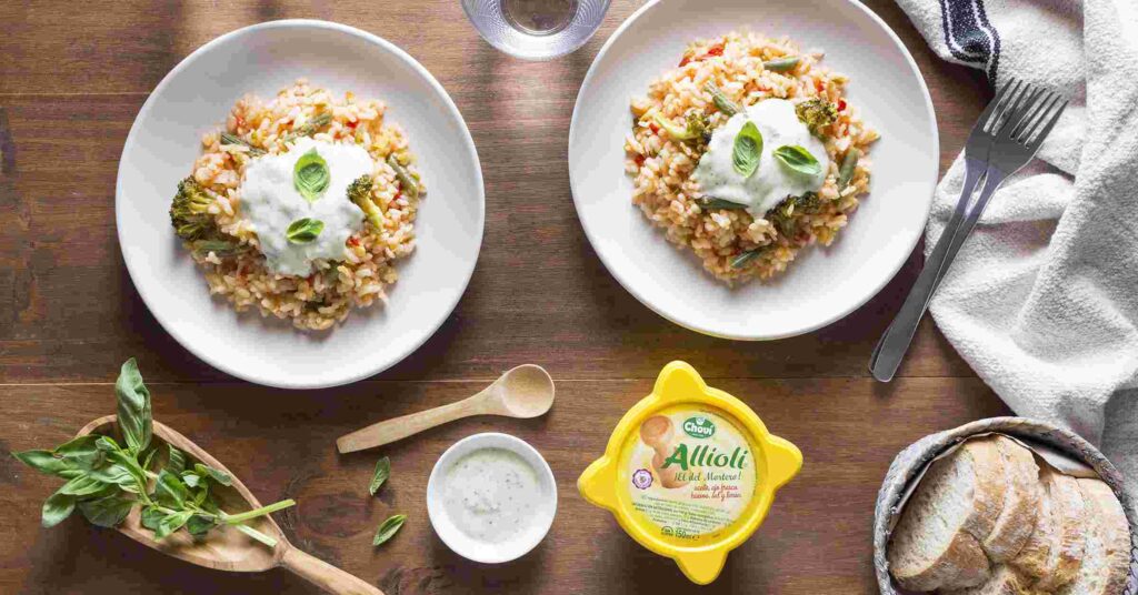 - Una vez el arroz de verduras este hecho, retira del fuego y deja reposar unos 5 minutos. Sirve con el Allioli Choví verde que has preparado y decora con hojitas de albahaca.